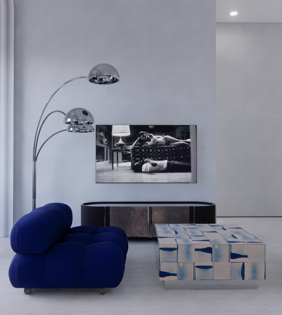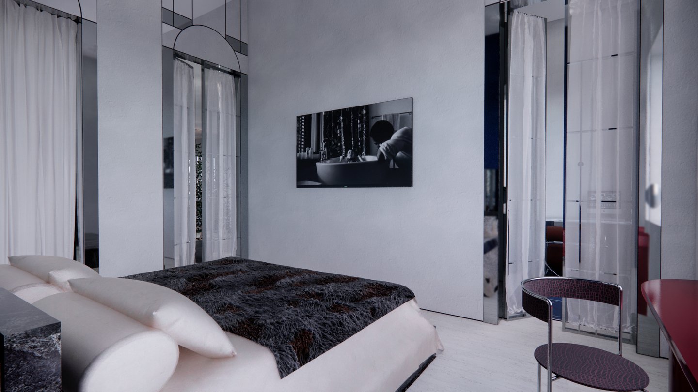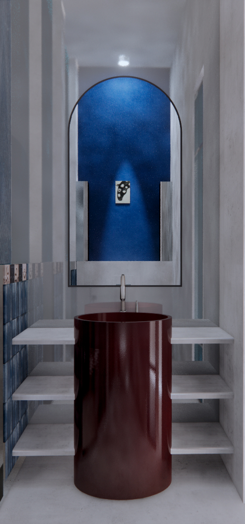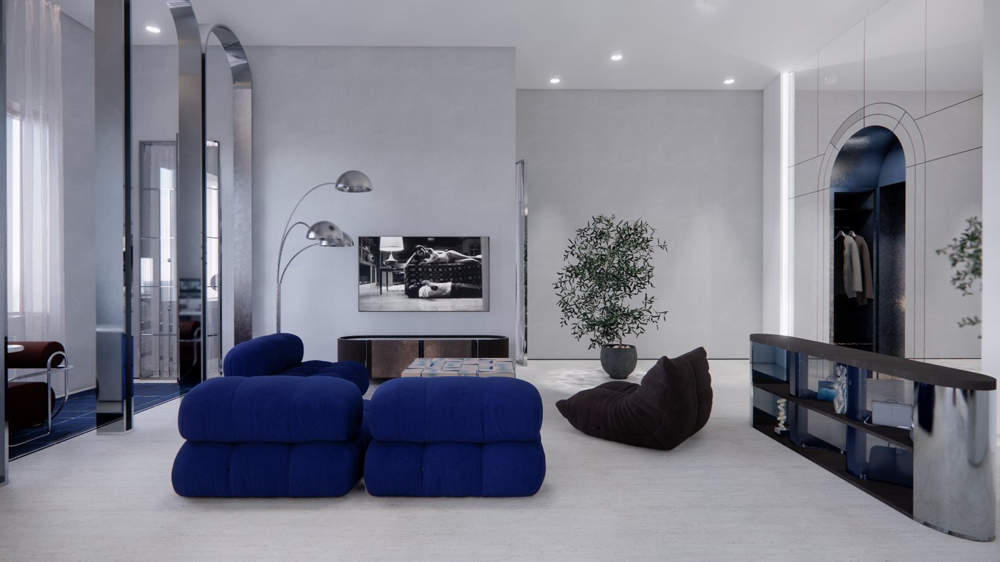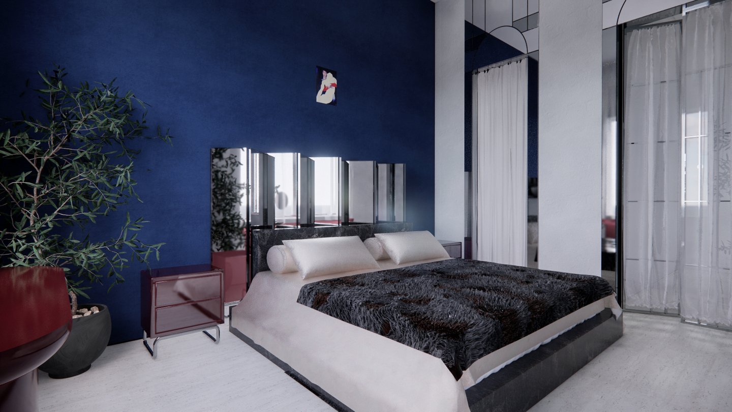 Единственное жилое помещение, отделенное сплошной перегородкой. Но такие визуальные решения как акцентный синий цвет, зеркала, смелые формы, стеклянные двери, ведущие в рабочий кабинет и основную зону — делают спальню логичными продолжением всего пространства.