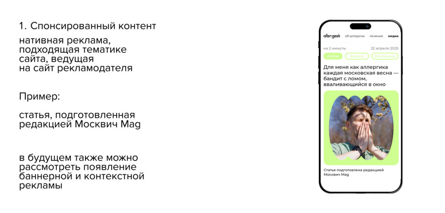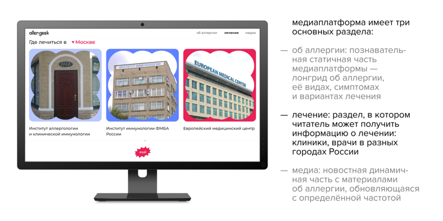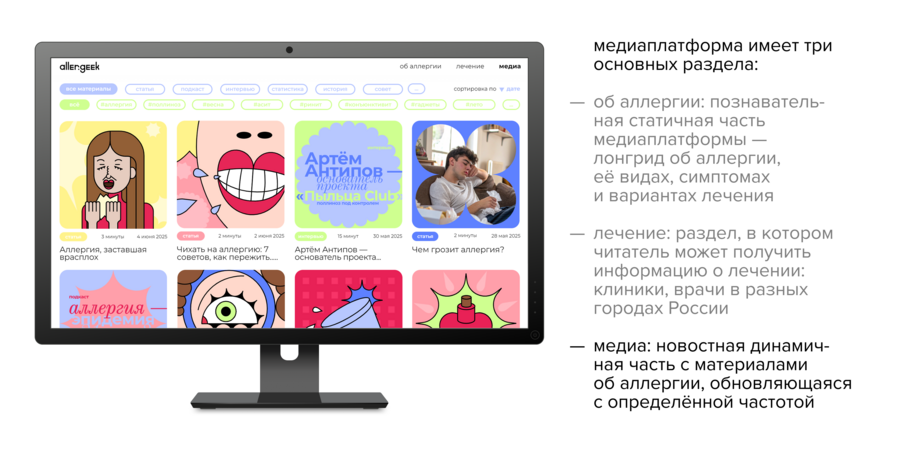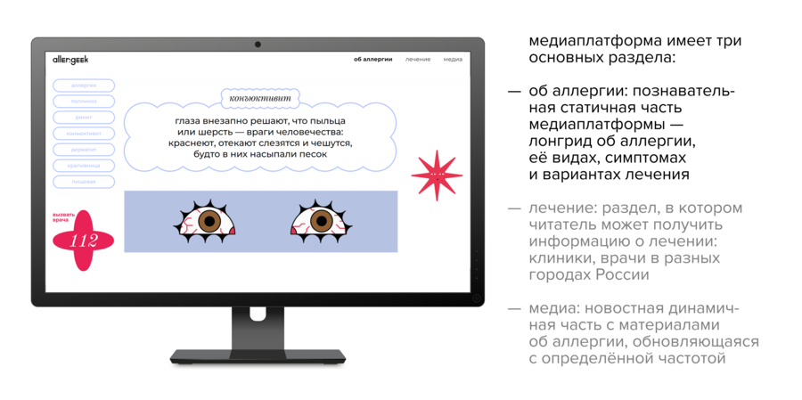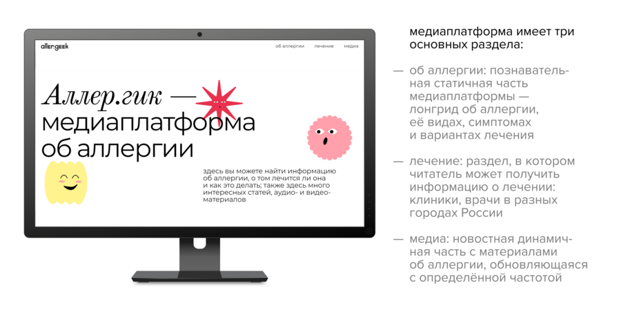 Медиа-платформа, с цепляющим взгляд дизайнерским решением, в которой каждый аллергик сможет найти ответы на свои страдания, что поможет их уменьшить. На платформе планируется размещение информации об аллергенах, бушующих в данный период времени, о том, как и куда от них бежать или как лечиться и у какого специалиста, а так же памятки и другие советы!