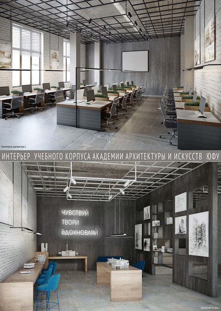 Проект выполнен по заданию Академии архитектуры и искусств для недавно построенного корпуса Академии в Ростове-на-Дону на ул. М.Горького, 77. С учётом существующего объемно-планировочного решения здания был разработан интерьер выставочного холла и компьютерной аудитории, расположенных на третьем этаже корпуса. За основу образного решения был выбран стиль «лофт», как напоминание о строительной основе специальности «Архитектура». Для обеспечения визуального комфорта выбрана отделка стен материалами серых оттенков — декоративный бетон, кирпич и рельефная штукатурка. Напротив, для формирования акцентов в интерьере применено оборудование и мебель активной цветовой гаммы. Запроектировано общее и местное освещение, создающее ровное мягкое освещение пространства и акцентированное для рабочих мест и экспонатов выставки. Проект интерьера ставил цель создать презентабельное и, в то же время, практичное пространство, создающее комфортную рабочую атмосферу.