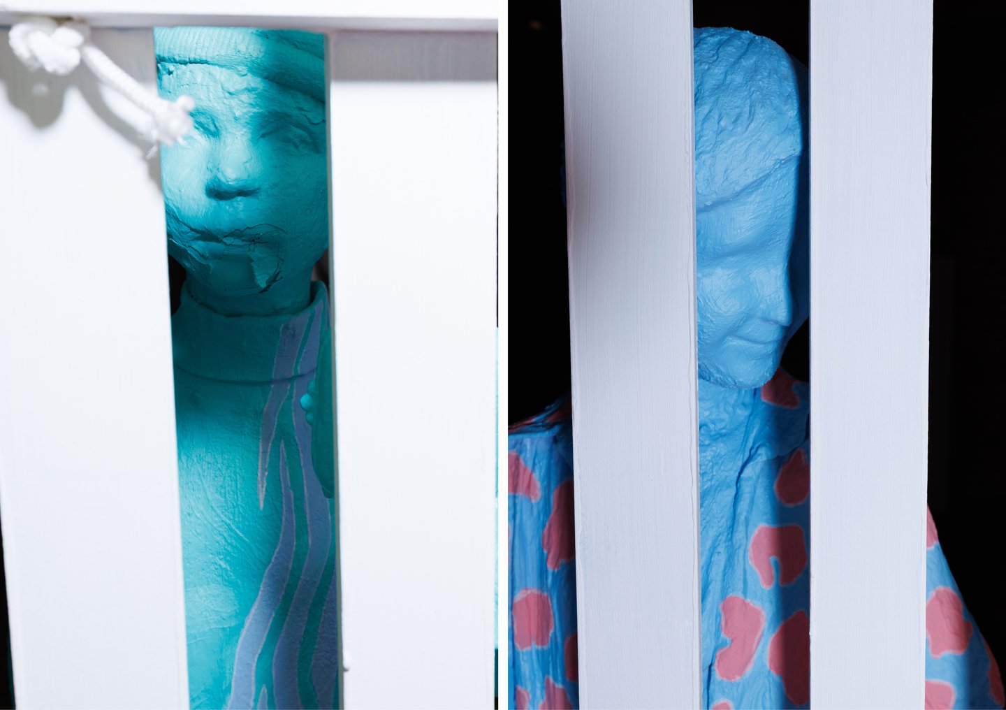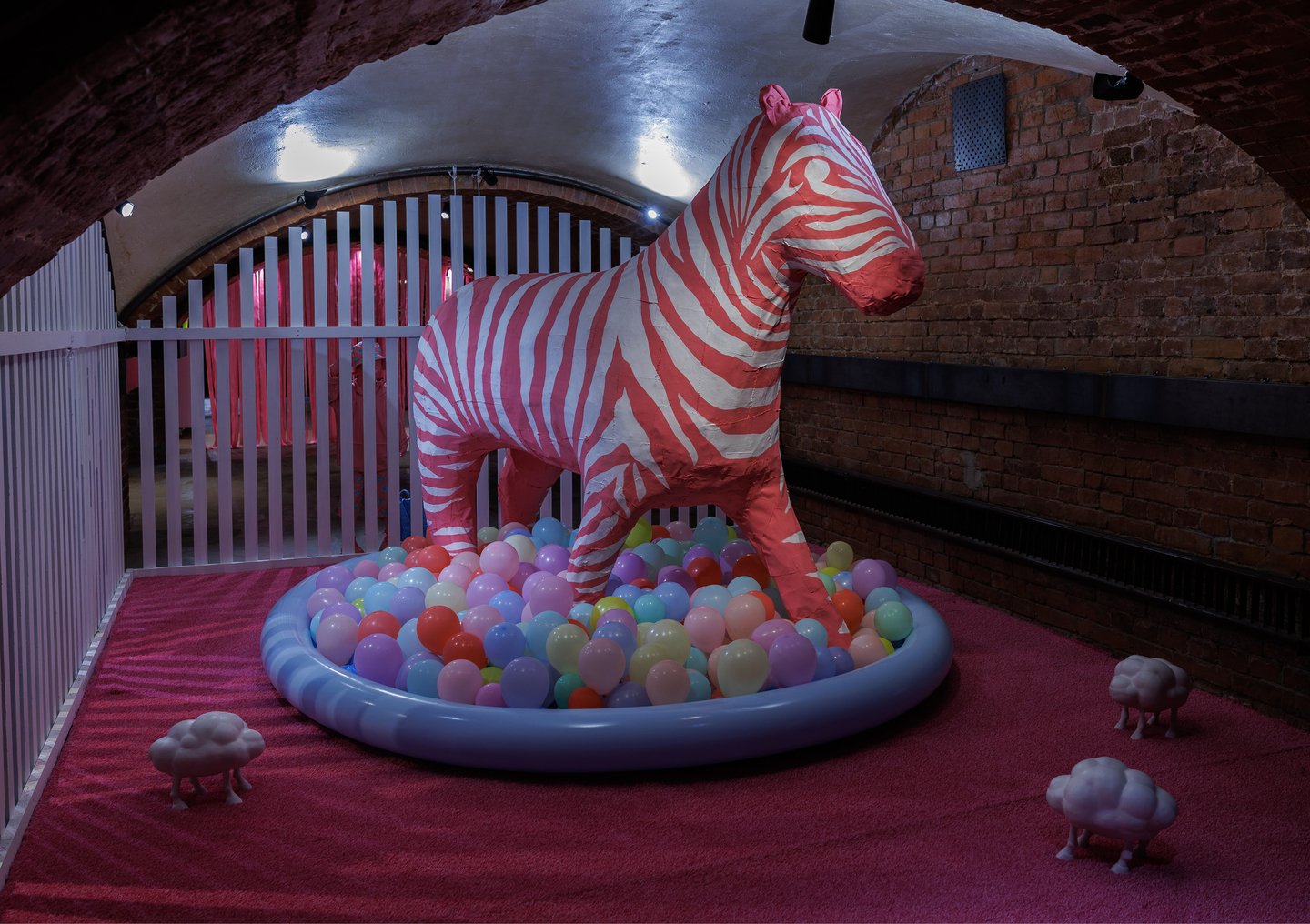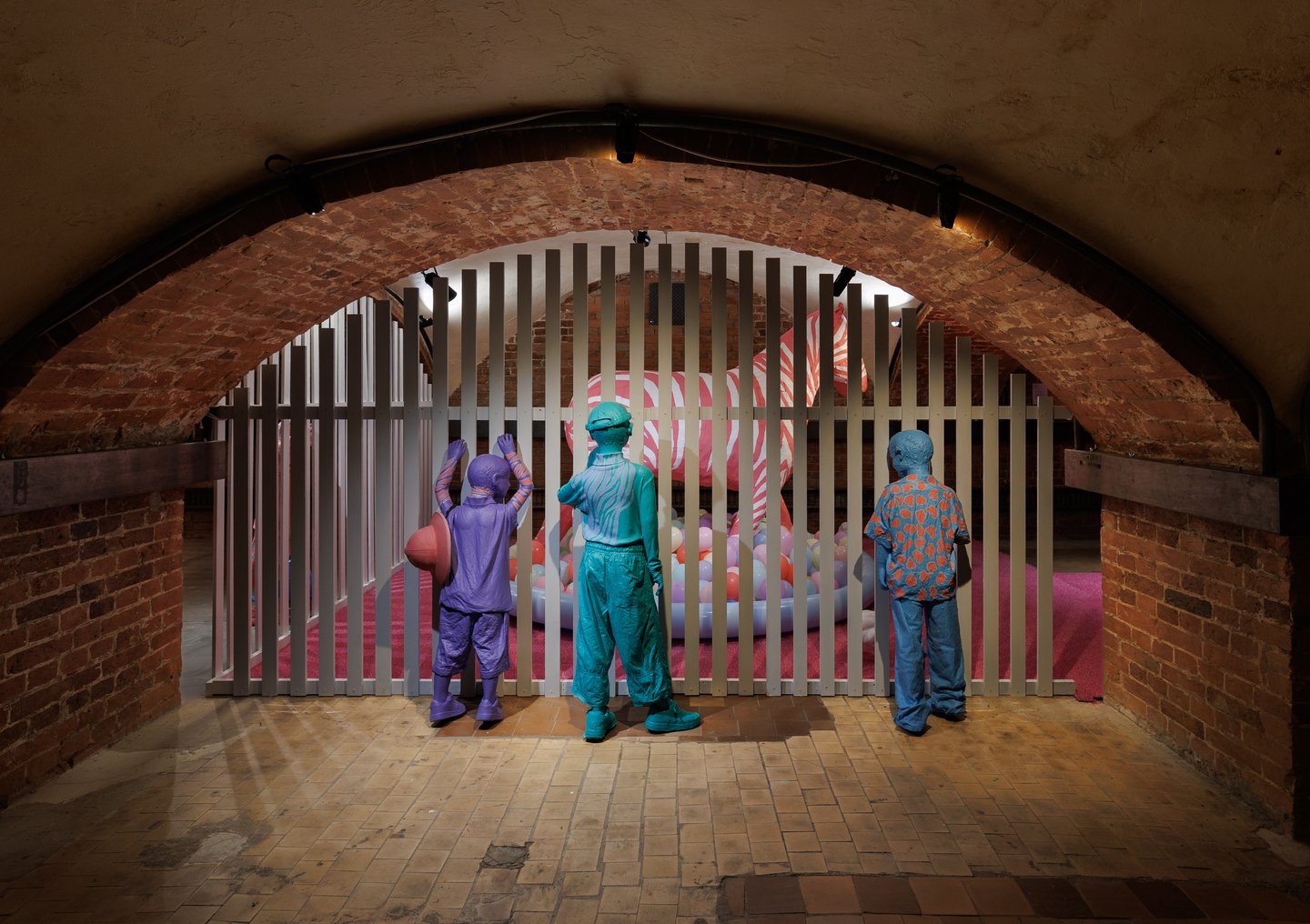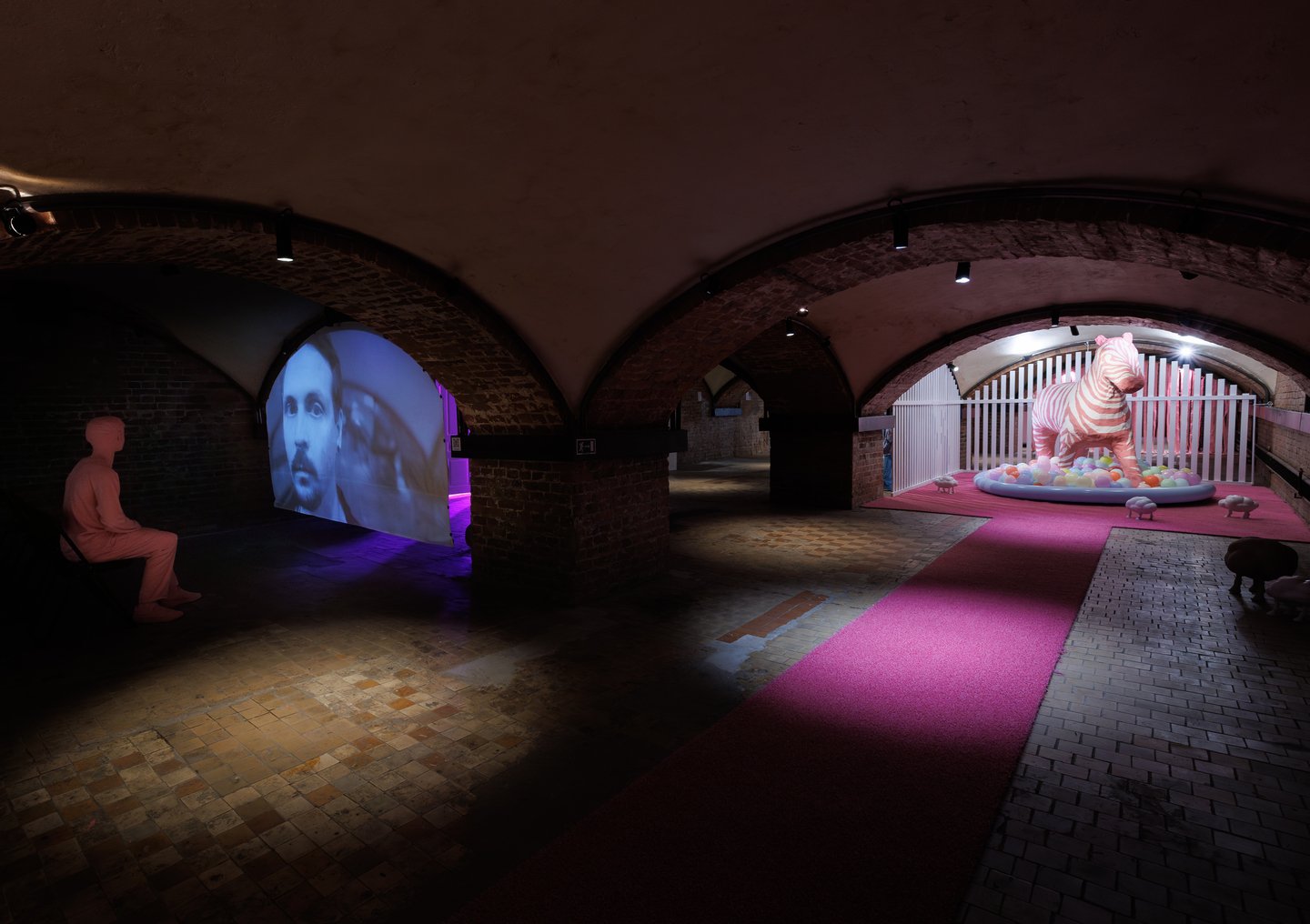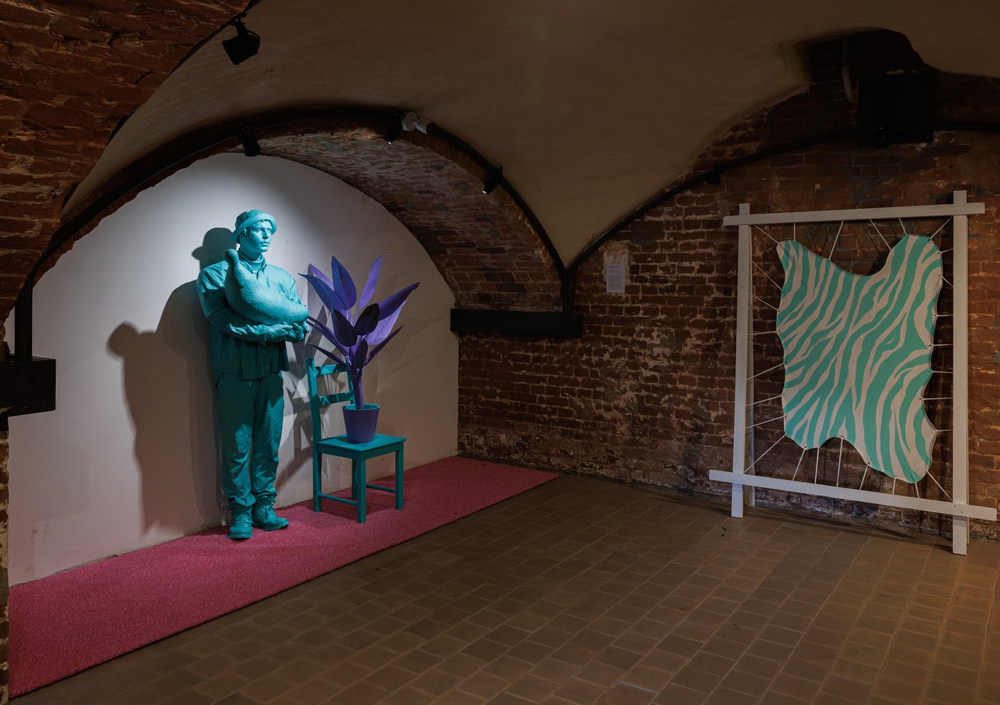 Инсталляция «Зоопарк» (2025) — еще один важный смысловой узел, расположившийся у центра выставки. Художник помещает в зале фигуры подростков, наблюдающих за гигантской розовой зеброй сквозь забор. Но зебра — недосягаемая, пустая оболочка, спроецированная фантазия, в которую нельзя войти. Художник наблюдает, но не может коснуться желаемого, совпасть с образом мечты, что вызывает внутреннюю злость.