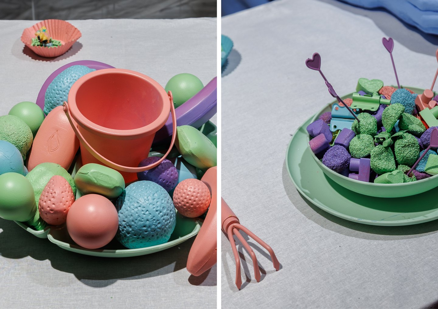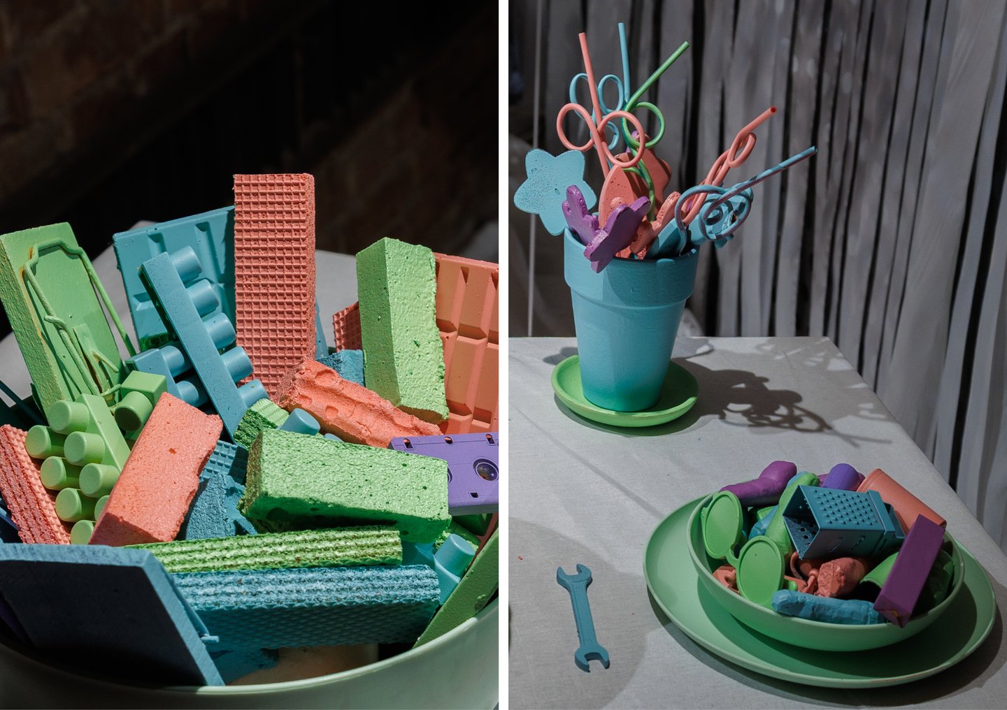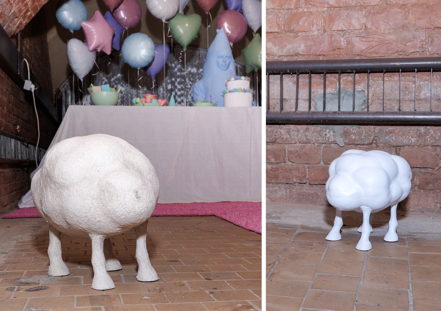 Слева: «Пиньяты», 2025. Инсталляция / Справа: «Фламинго и я», 2025. Инсталляция