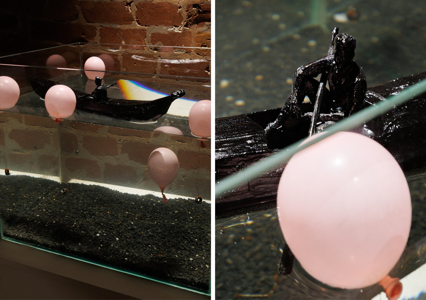 Инсталляции «Дальнее плавание» и «Вечеринка у бассейна» (обе — 2025) привносят символику воды и метафору Одиссеи — эскапизма, который давно перестал быть утешением, и вечного путешествия. Художник продолжает имитировать игру возрастов и эмоционально-телесных режимов через дихотомию: иронии и тоски, действия и бездействия.