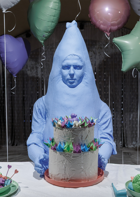 О необъяснимом, очень странном и даже немного страшном празднике художник говорит в инсталляции «Праздник» (2025): здесь персонаж человека-банана сидит за столом с вырванной из контекста атрибутикой: пластиковой едой, кубиками, мышеловкой, гипсовыми пальцами.