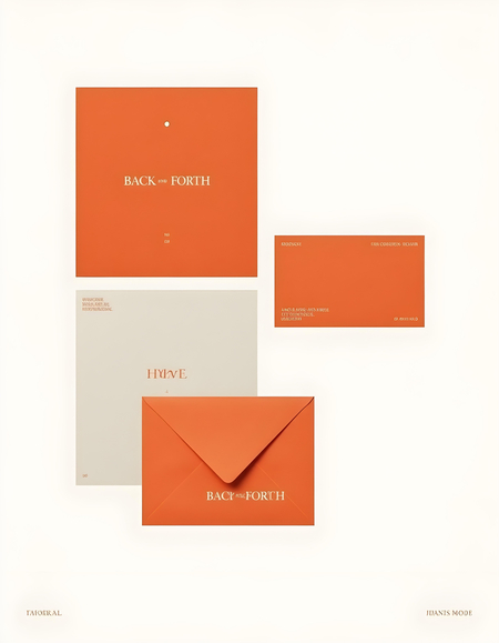 promt: mockup of printed materials paper, envelope, business cards on a white background for the «BACK and FORTH» brand identity with display font logo for modular inflatable furniture with orange colors