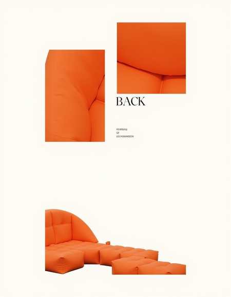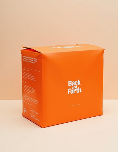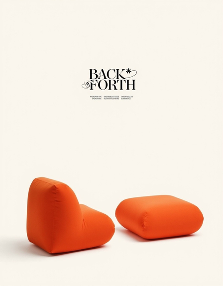Promt: An cargo aethtic and minimalist «BACK and FORTH» brand identity for modular inflatable furniture. Highlight sustainability with orange color. The design should feature clean, airy layouts with simple, modular shapes. Showcase display font logo with organic forms, eco-friendly packaging