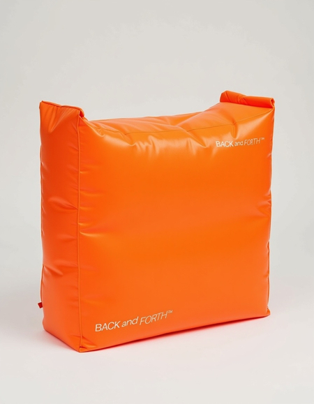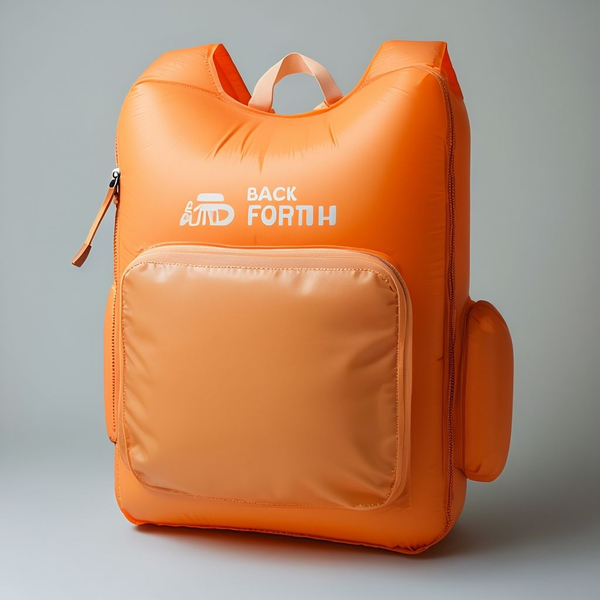 Promt: make An eco-friendly inflatable backpack in orange color. Showcase branding elements such as a logo «BACK AND FORTH»