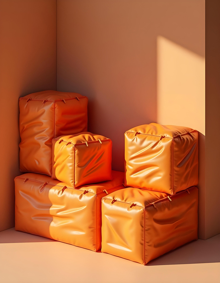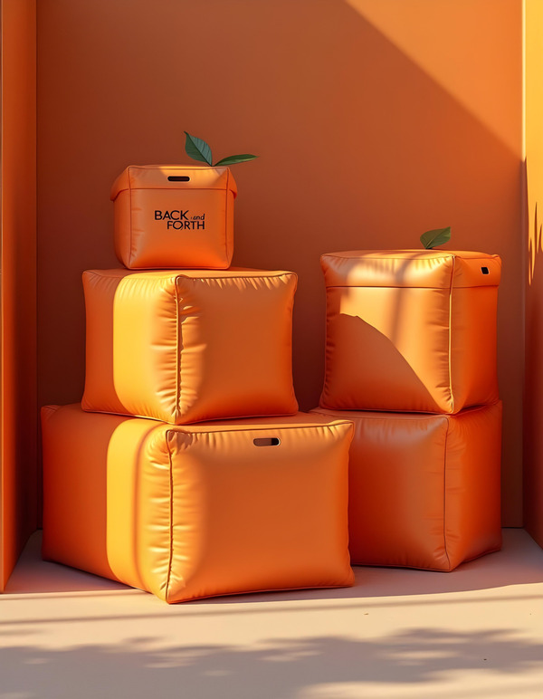 promt: A 3D render of shelf cargo boxes with logo «BACK and FORTH» brand identity for modular inflatable furniture. Highlight sustainability with orange color