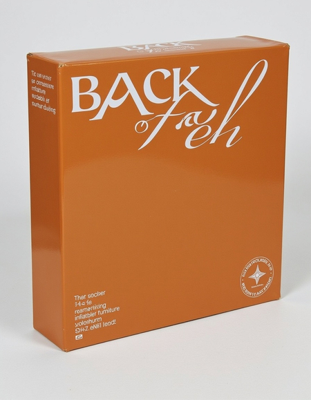 Promt: An cargo box with display logo «BACK and FORTH» brand identity for modular inflatable furniture. Highlight sustainability with orange color.