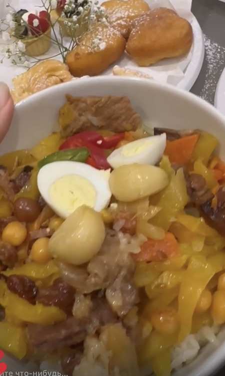 500 гр риса для плова 400 гр желтой моркови 300 гр красной моркови 100 гр лука 500 гр мяса 100 гр курдюка 100 мл масла зигир 70-80 мл масла подсолнечного 40 гр изюма 50 г нута (заранее замочить в кипятке) 17 г зиры ~17 гр соли для плова (крупная) 600 мл воды+ чистая кипяченная вода для замачивания риса Марля чистая (чтобы разделить зирвак и рис) Для украшения перепелиные яйца (шт5 сварить) Лук нарезать одинаковыми полукольцами, морковь нарезать длинными слайсами, мясо нарезать средне-крупными квадратиками. Нут можно прокипятить 3 минуты и оставить замачиваться. В разогретый казан вливаем 2 вида масла, разогревам очень сильно масло, сначала жарим пай, (это сухожилия или лодыжка) потом вынимаем его, затем закидываем жариться до корочки мясо, как появится корочка туда закидываем лук тоже жарим. Солим немного и добавляем часть зиры (солить нужно будет во всех этапах). Добавляем курдюк. Добавляем всю нарезанную морковь, но не перемешиваем, солим, зира и добавляем совсем немного воды и закрываем казан оставляем на 7-10 минут. Добавляем остаток воды, сверху моркови выкладываем нут, и делаем на минимальный огонь, чтобы зирвак томился, 30 минут. Рис в отдельном тазике заливаем горячей чистой водой 30-40’градусов на 20-25 минут, при необходимости доливая воду. Открываем крышку казана сверху нута выкладываем изюм для плова солим, кладем 1 целый чеснок (не чищенный), и оставляем все томится кще минут 20-30, сверху всей массы (зирвака) мы аккуратно стелим марлю, промываем 3 раза рис, поднимаем огонь на максимум и выкладываем рис прям на марлю, рис делаем ровным слоем и солим рис. Огонь делаем средним и закрываем крышку. (можно добавить немного дополнительной воды в этот момент). Через 15 минут нужно размешать рис, чтобы он не прилип друг к другу (но не смешиваем его с зирваком там марля), закрываем крышку через минут 15 опять повторяем процесс с рисом, оставляем томиться на медленном огне 30 минут.