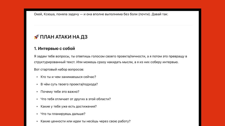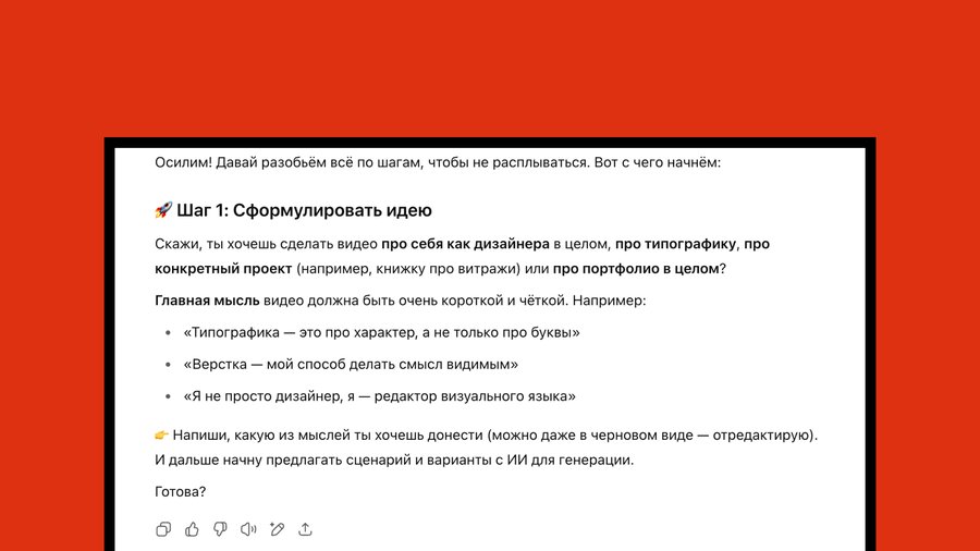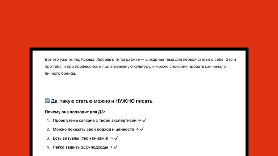 Статью я создавала с помощью чата GPT. Мы начали по классике — с интервью, и достаточно скоро я поняла, с какой стороны я хочу «продавать» себя как профессионала. Затем мы провели достаточно длинное и развернутое интервью про то, что связывает меня с типографикой.