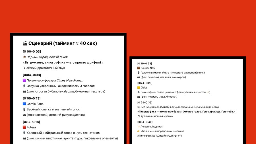 На основе этой идеи я с помощью ChatGPT разработала сценарий: распределила тайминг, выбрала шрифты и описала характер каждого. Для усиления эффекта мы подобрали для каждого шрифта соответствующие музыкальные фрагменты и визуальные ассоциации (от строгой библиотеки до сверкающего подиума).