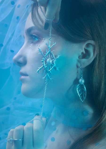 Ювелирные украшения, вдохновленные рисунками, изображающими радиолярии, из книги Эрнста Геккеля «Красота форм в природе». Мне хотелось воплотить хрупкость этих одноклеточных организмов, их эфемерность и воздушность, показать, что люди и радиолярии на самом деле очень похожи.