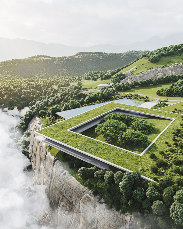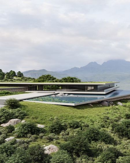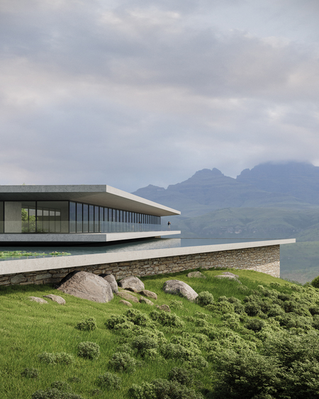 The architectural concept is based on functionalism. This project serves as an example for how architecture can work with the surrounding landscape: the building is integrated into the layout. Natural finishing materials with refined texture create tactile and visual comfort. The twisted game of clear lines and smooth planes of the facade emphasises the beauty of the surrounding nature. Massive panoramic glazing diffuses the boundary between the interior and exterior. A small decorative reservoir makes «the hanging part» of the hotel very light and airy, as if it is floating in the air above the valley. Furthermore, this hotel becomes an organic continuation of the beautiful nature and vice versa.