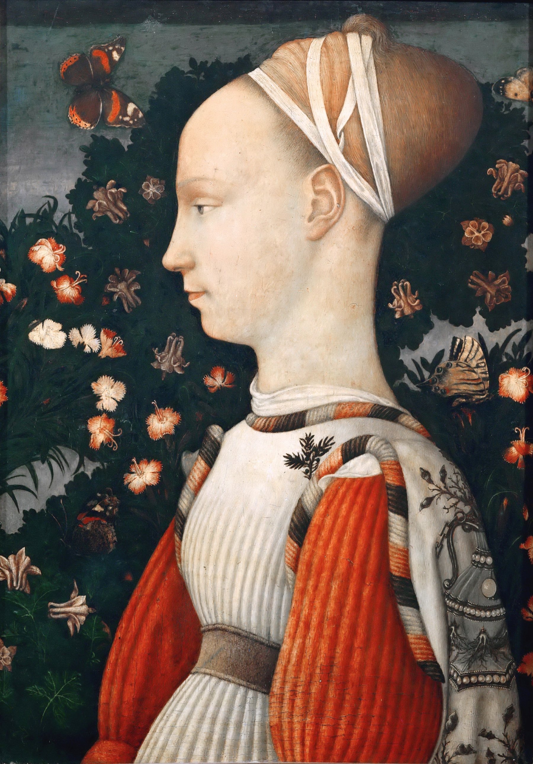 Существует предположение, что портрет был создан посмертно: Джиневра д’Эсте вышла замуж за кондотьера Сиджизмондо Малатесту, приходившегося ей одновременно дядей и двоюродным братом, и умерла при загадочных обстоятельствах. Историки выдвигают разные версии её гибели — от отравления из-за бесплодия или измены до убийства, связанного с желанием мужа жениться на более политически выгодной кандидатуре. Интересно, что бабочка, изображённая над головой принцессы, в таком случае может символизировать раннюю смерть и воскресение. В настоящее время работа находится в Лувре в Париже.