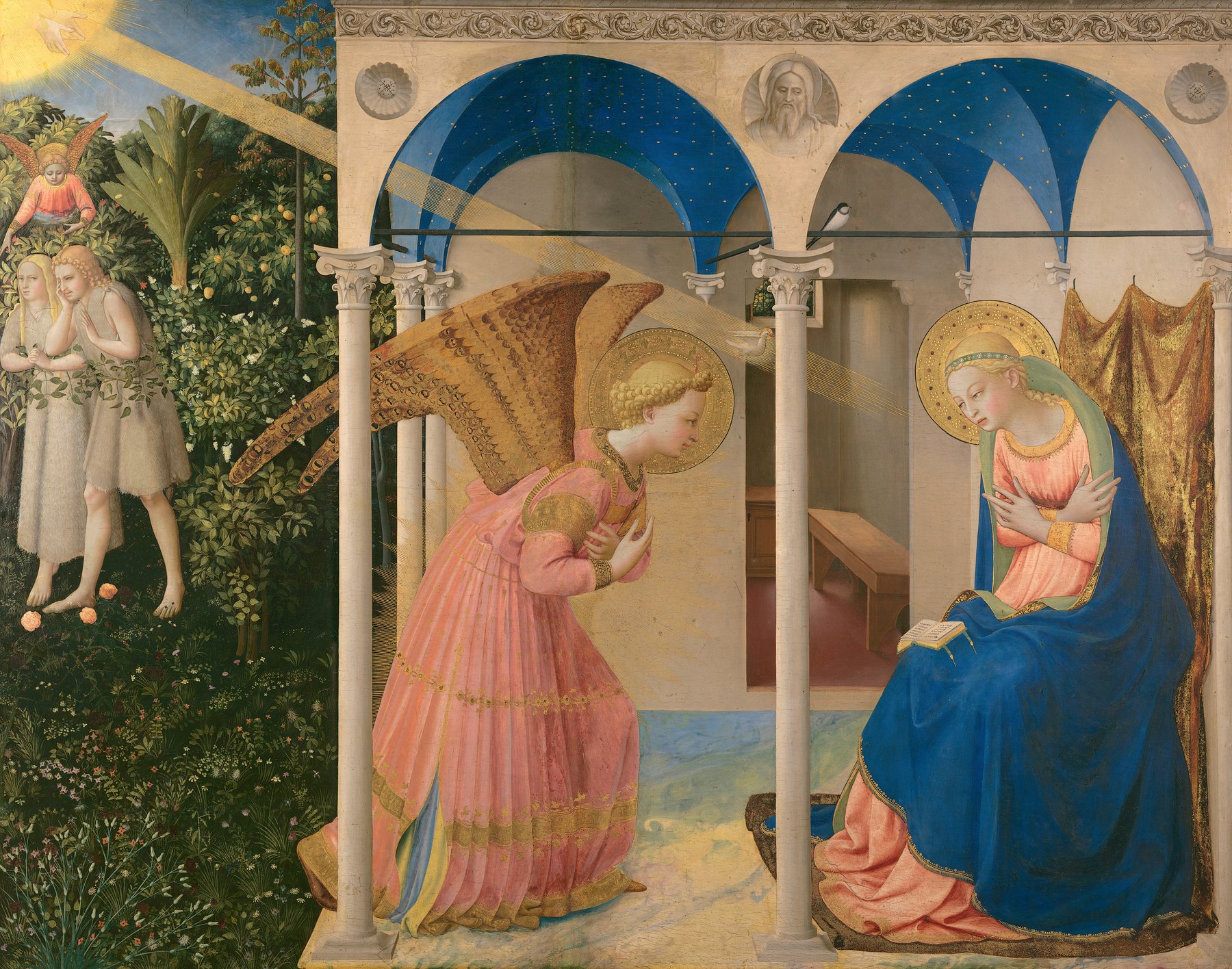 Фра Беато Анжелико создал алтарный образ «Благовещение» в эпоху Раннего Возрождения, около 1425 года, для церкви Санто Доминго, расположенной недалеко от Флоренции. Эта картина, написанная темперой на деревянной доске и обрамленная резной позолоченной рамой, изображает ключевую сцену из Нового Завета, где архангел Гавриил является Деве Марии с известием о том, что она станет матерью Христа.