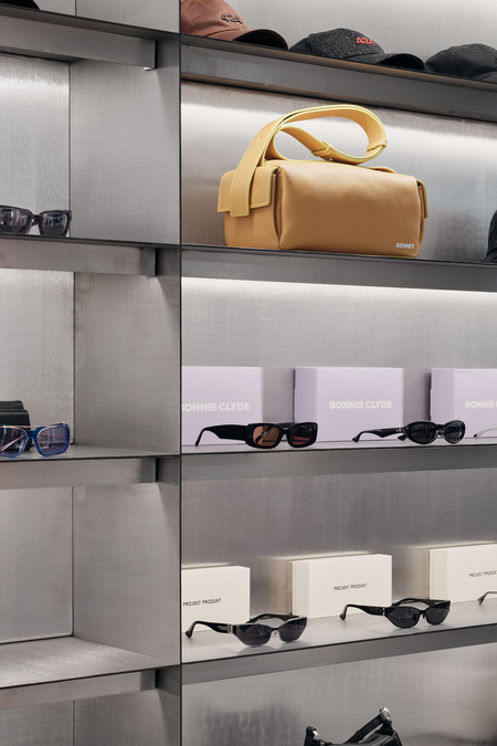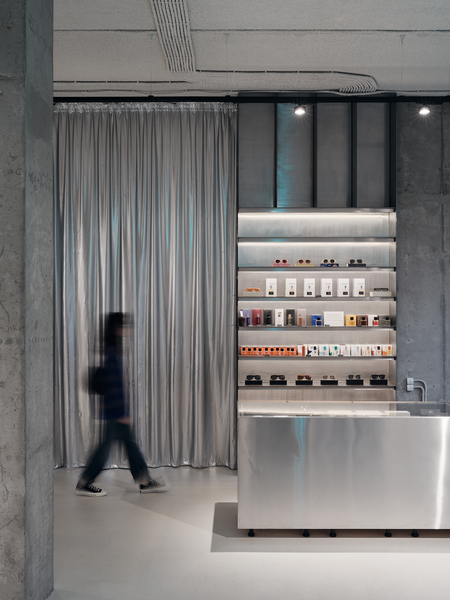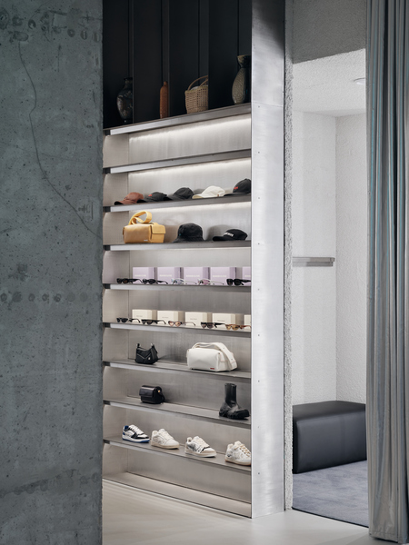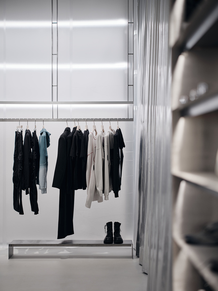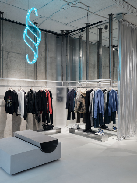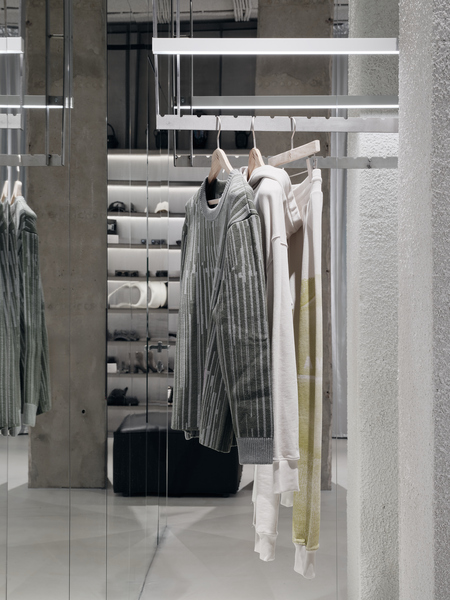 Интерьер решили сделать монохромным, и в качестве основных материалов использовали бетон, штукатурку и сталь. На нейтральном фоне предметы одежды, обувь и аксессуары будут выглядеть как арт-объекты. Освещение решено с помощью встроенной подсветки, спотов на потолочных шинах, которые при смене коллекций помогут правильно расставить световые акценты.