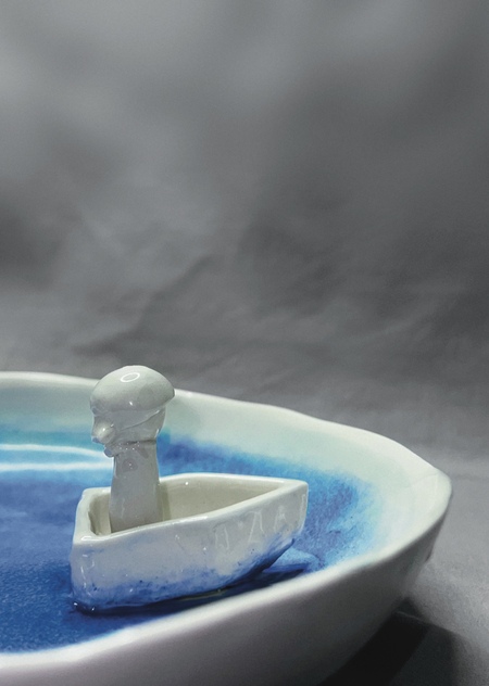 Конечная цель этого проекта заключается в создании набора посуды, олицетворяющего определенную тему. В данном случае, основой идеи послужила история о маленьком лодочнике, который стремится найти остров. Используя фарфоровую фигурку персонажа, я хотела передать визуальный эффект водной поверхности и её непроглядной глубины.