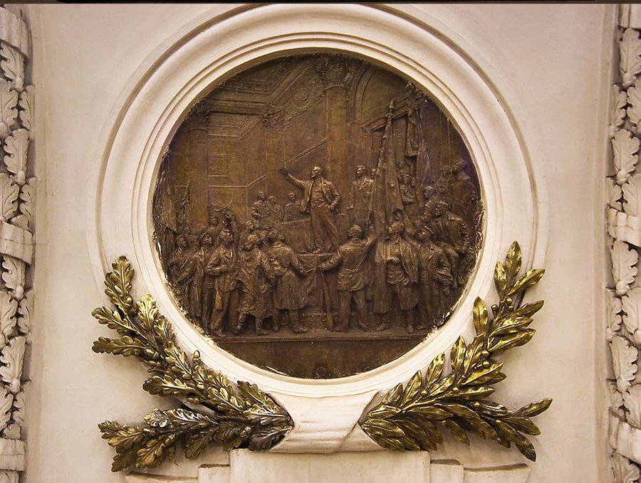 Художественное оформление станции также посвящено становлению советской власти. Пилоны главного зала украшены литыми медальонами с изображениями революционных событий, а потолок декорирован гирляндами из листьев аканта.