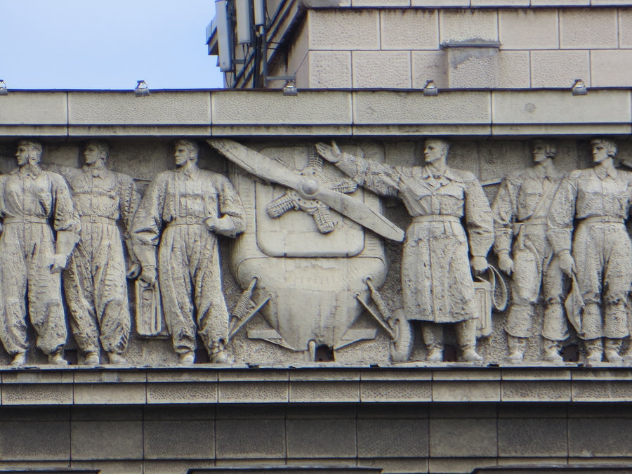 Фриз работы скульптора Николая Васильевича Томского выполнен в стиле соцреализм, монументальная скульптурная композиция, продолжающая общую концепцию здания, растянулась по длине на 100 м. Сюжет ее посвящен достижениям класса рабочих, само расположение определяет концепцию применения, так как выше этой композиции расположен только герб страны.