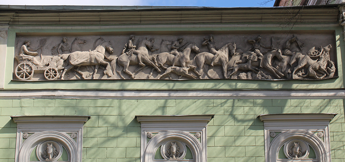 После перестройки служебный корпус обрел на внутреннем фасаде фриз, выполненный Петром Карловичем Клодтом, известным анималистом и специалистом по лошадям, его работы отличаются степенью проработки деталей и динамикой. Данная работа имеет собственное название «Служение лошади человеку» и сюжет, посвященный участию лошади в деятельности человека, как созидательной в труде, так и разрушительной на войне. Данный элемент избавляет внутренний фасад здания от монотонности и избыточной простоты, напоминает о его назначении и в понятной форме передает идею автора.