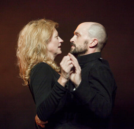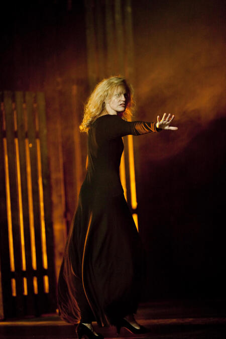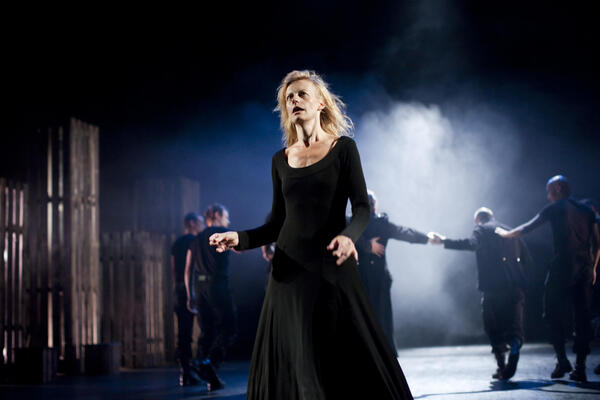 Ангела Винклер играет Леди Макбет как разрушенную фигуру. Её тело напряжено, движения сбивчивы, голос неуверен. Это не властная женщина, а героиня на грани срыва. Она больше страдает, чем управляет.