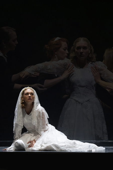 Постановка оформлена минималистично: практически пустая сцена, белые стены, нейтральный свет, подчёркивающий монохромность. Визуальная сдержанность делает любые движения персонажей особенно напряжёнными, почти болезненными. Пространство напоминает не замок, а лабораторию, где чувства подлежат вскрытию. Это подчёркивает психологическую природу действия: здесь царят не страсти, а внутренняя тревога и отчуждённость.