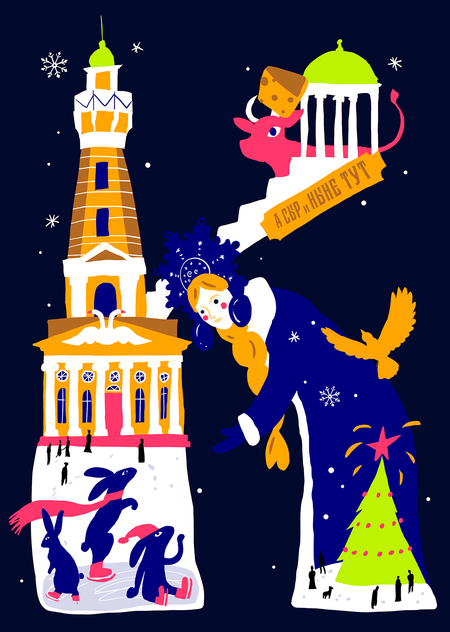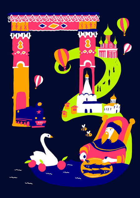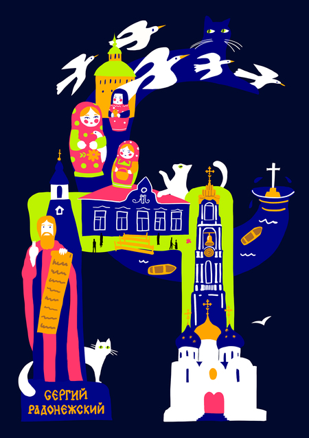 Дизайн открыток строится на использовании яркой, насыщенной цветовой палитры и игривой стилизации, где каждая буква названия города формируется из узнаваемых символов, архитектурных памятников, исторических персонажей и культурных атрибутов, связанных с этим регионом. Такой подход создает визуальный калейдоскоп, который одновременно отражает индивидуальность каждого города и общее культурное наследие Золотого кольца.