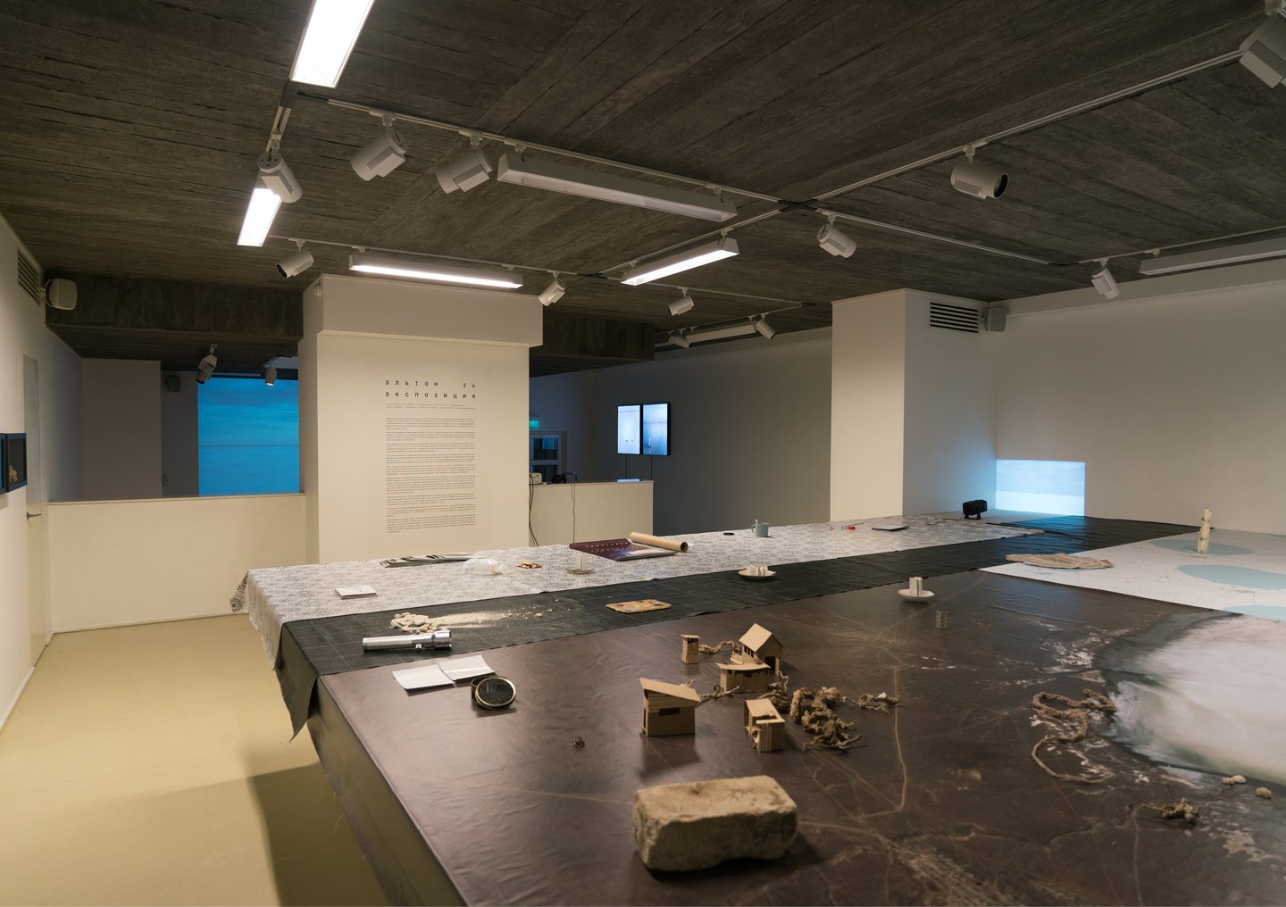 Местом объединения в экспедиции часто служил общий стол, за которым авторы принимали пищу, работали и общались. На выставке стол, расположившийся в центральном большом зале, увеличивается в размерах, становясь тотальным коллажом взаимодействий. Коллаж этот включает артефакты, эскизы, наработки проектов художников, а также бытовые предметы, окружавшие участников во время пребывания в Эльтоне.