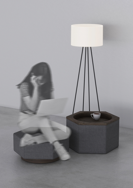 «ГАЙКА» — это многофункциональный пуф-трансформер, состоящий из двух модулей: нижнего и верхнего. В собранном виде продукт представляет собой высокое сиденье, а в разобранном — низкий пуфик с кофейным столиком. Форма гексагона и принцип соединения восходят к образу болта и гайки. Общие габариты — 520×470 (h) мм.