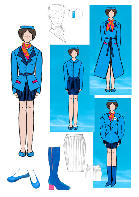 Если сапожки, то на прочном широком каблуке в тон фирменным цветам! Для основной обуви рекомендую балетки небесно-голубого цвета! Одежда содержит также основной цвет авиакомпании, дополнением которого служит темно-синий цвет, также содерждащийся в брендбуке компании. Разнообразие вводят аксессуары — платок и шапка болртпроводника.