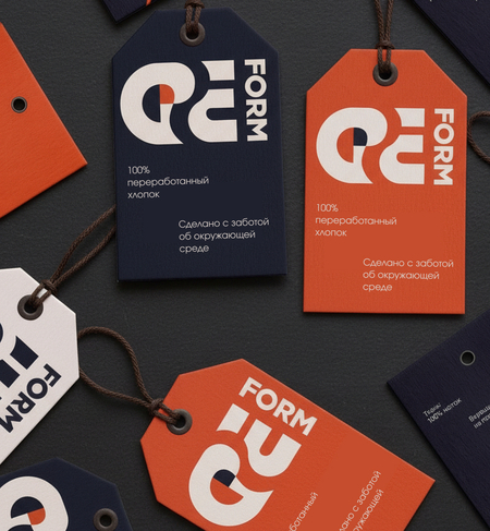 Нейросеть: Recraft AI Модель: Nano Banana Промт: Professional clothing tags design for the «ReForm» brand. The tags should be hang tags, rectangular with slightly rounded edges, or a custom geometric shape, similar to the provided «c+v» example. Incorporate the new «ReForm» logo prominently. Use the brand’s primary color palette: deep navy blue, off-white/cream, and an earthy terracotta/burnt orange. Design two versions: one side primarily deep navy with off-white text and logo, the other side primarily earthy terracotta with off-white text and logo. Text elements to include: «Ткань: 100% переработанные волокна», «Сделано: с заботой о будущем», «Производство: Сделано с ReForm». Font should be a clean, geometric sans-serif. The overall style should be minimalist, modern, and consistent with the new ReForm logo. Дополнительно: исправлен текст в Figma.