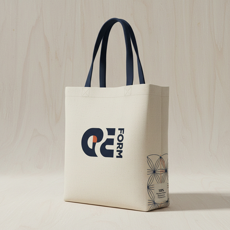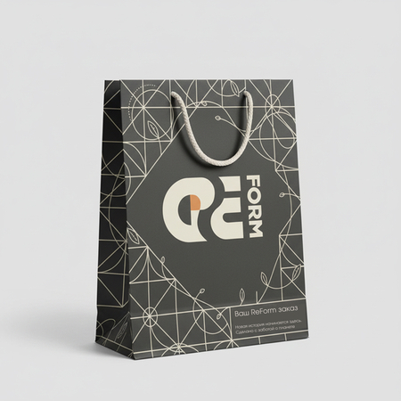 Нейросеть: Recraft AI Модель: Nano Banana Промт: Professional shopper bag design for the «ReForm» brand. The bag should be made from thick, recycled cotton canvas or durable organic material. Main body color: deep navy or natural off-white. Feature the «ReForm» logo prominently on one side in contrasting color. On the other side or as an accent, incorporate a subtle geometric, grid-like pattern (similar to the original «c+v» packaging, but slightly softer or with lines that resemble interwoven fibers or abstracted leaves) in white or a complementary color. Handles should be strong and minimalist. Use the brand’s primary color palette: deep navy blue, off-white/cream, earthy terracotta. The design should be minimalist, modern, and high-quality, reflecting sustainability and premium feel.