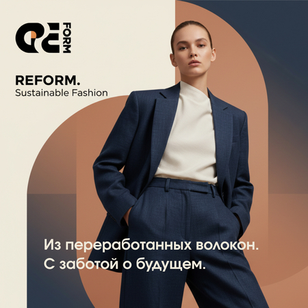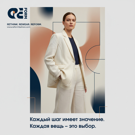 Нейросеть: Recraft AI Модель: Nano Banana Промт: Professional promotional poster design for the «ReForm» sustainable fashion brand. Minimalist and modern aesthetic, consistent with the brand’s identity. Feature a stylishly dressed person (gender-neutral or diverse) wearing ReForm clothing, with a focus on the fabric’s texture and clean lines. The background should be abstract, blending geometric patterns with soft, organic gradients, suggesting transformation. Use the brand’s primary color palette: deep navy, off-white, earthy terracotta. Integrate the «ReForm» logo. Clean typography, sophisticated composition. Digital advertisement style, suitable for high-end fashion. Дополнительно: наложен текст в Figma.
