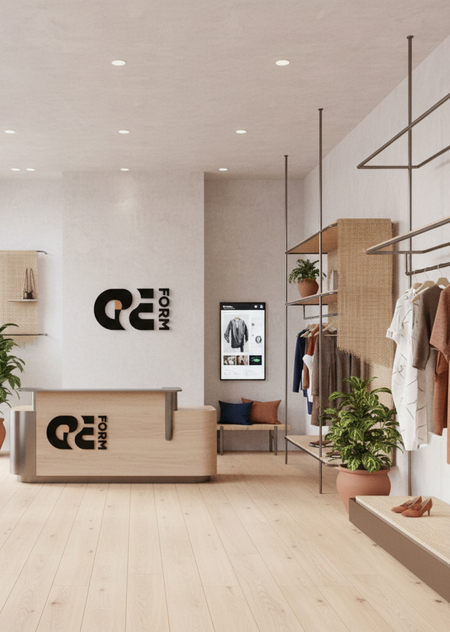 Нейросеть: Recraft AI Модель: Nano Banana Промт: Realistic interior design of a modern, minimalist offline store for the «ReForm» sustainable fashion brand. The space should evoke a sense of innovation and environmental consciousness. Key elements: clean lines, abundant natural light, and a curated, uncluttered feel. Use raw, sustainable materials like light wood (birch or bamboo), polished concrete floors, textured plaster walls, and natural fibers for displays. Incorporate subtle accents of deep navy blue, off-white, and earthy terracotta in decor or display elements. Display areas should elegantly highlight the clothing’s texture and form. The «ReForm» logo should be subtly integrated into the signage, reception desk, or wall art. Thoughtful placement of indoor greenery (potted plants) to add life. High-tech feel, yet grounded and organic. Architectural visualization, bright and inviting atmosphere.
