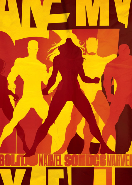 prompt: a poster with yellow orange and red colors featuring mervel comics universe male and female characters simplified