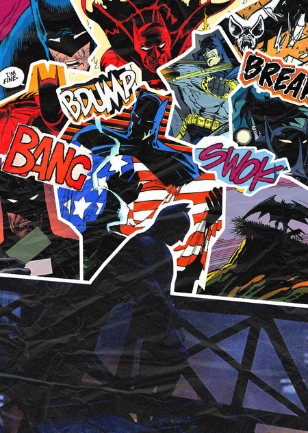 Кадры из фильмов «Бэтмен: Начало» и «Темный рыцарь», Кристофер Нолан, 2005|2008; Иллюстрации из комиксов «Бэтмен. Год первый», Фрэнк Миллер, 1987, «Длинный Хэллоуин», Джозеф Лоэб, 1996-1997