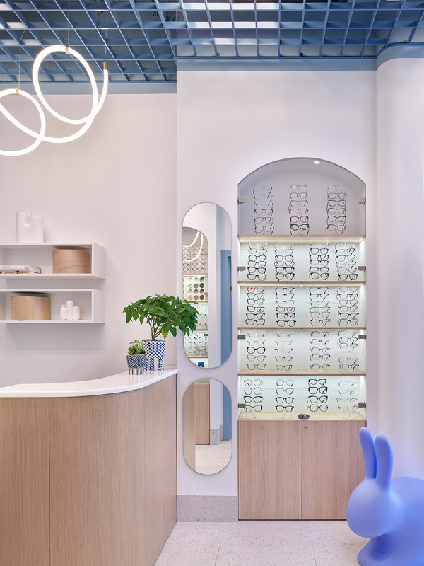 Небольшая офтальмологическая клиника и салон очков Мосоптика для взрослых и детей расположена в новом ЖК Варшавская Life на юге Москвы. Задача разместить на скромной площади (48 м²) три кабинета, ординаторскую, зону ресепшена, зону ожидания для пациентов, витрины с очками и с/у была непростой. Вымеряли и взвешивали каждый сантиметр. Кроме того, заказчики хотели получить модный интерьер, который был бы привлекательным как для семей с детьми, так и обычных посетителей. В целом, пространство сделали белым с использованием холодных акцентных голубых, синих, зеленых оттенков. Скругленные формы, асимметрия в композициях, сочетание натурального дерева, стекла, необычных светильников и предметов декора позволило сделать проект запоминающимся и современным. Не забыли и про малышей. Для них выделили специальную зону с веселыми круглыми постерами и двумя забавными зайцами от итальянской компании Qeeboo, на которых можно удобно посидеть. А зеркала в клинике спроектированы таким образом, что ребенок или взрослый любого роста найдет, где посмотреться и примерить очки.