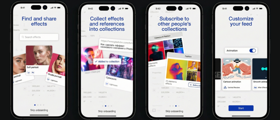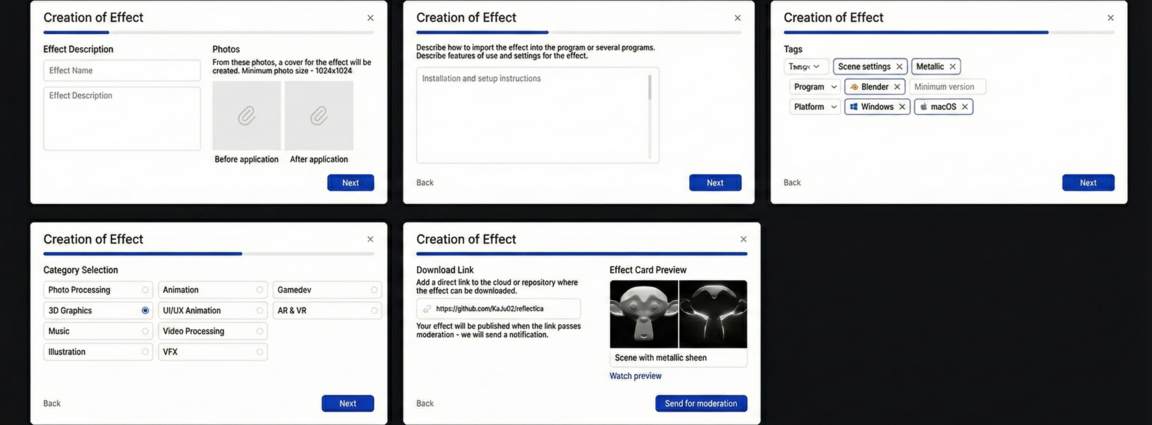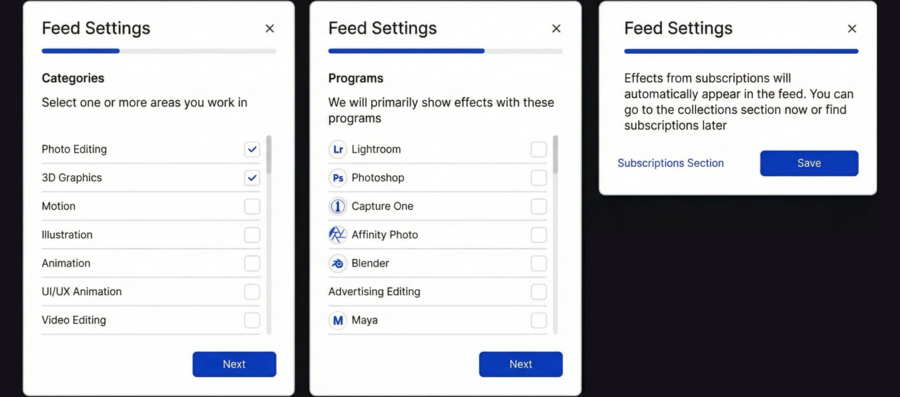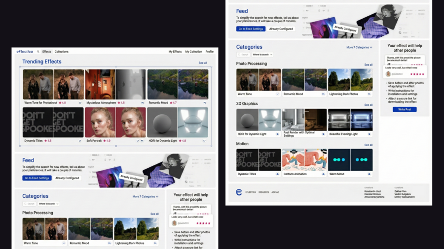 Eflectica applies the logic of Optimal Distinctiveness [1] by designing for both differentiation and assimilation: users can personalize their feed so it adapts to selected categories, preferred editing software, and subscriptions, which helps each creator build a workflow that reflects their own aesthetic priorities and goals. At the same time, belonging is reinforced through shared practices—discussion in comments under effect pages, feedback exchanges, and the collective archive of presets itself, where publishing an effect is framed as a contribution to the community’s shared resource base.
