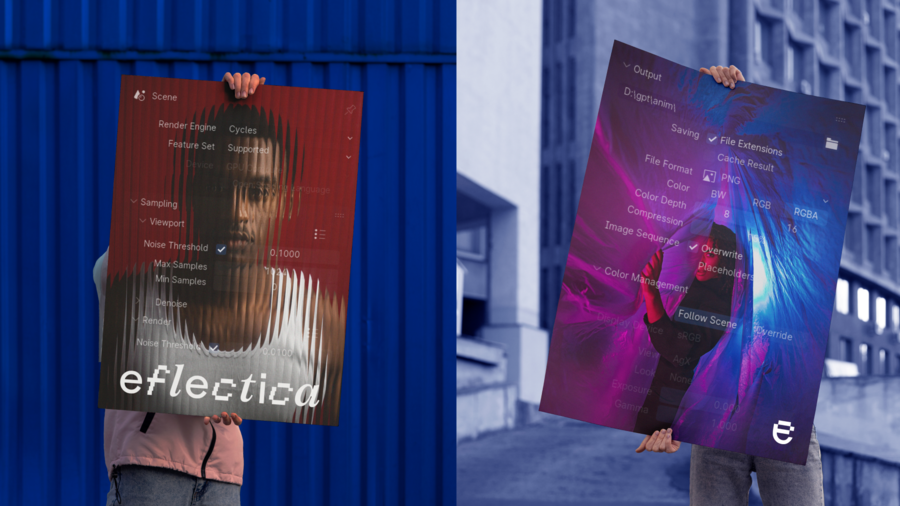 Eflectica’s visual language layers high-impact imagery—portraits with dramatic effects, stylized lighting, or digitally processed scenes—with recognizable interface fragments from editing software (menus, sliders, node trees, render settings). This technique makes the value proposition instantly legible: the visuals don’t just talk about effects, they show effects in action with the tools visible, signaling insider knowledge and creating immediate recognition for creators who already work in Blender, Photoshop, or After Effects.