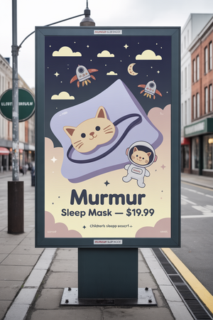 A simple 2D illustrated billboard advertisement for «Murmur» children’s sleep products. The billboard displays a soft sleep mask shaped like a cute kitten in a tiny space helmet.