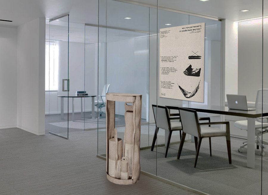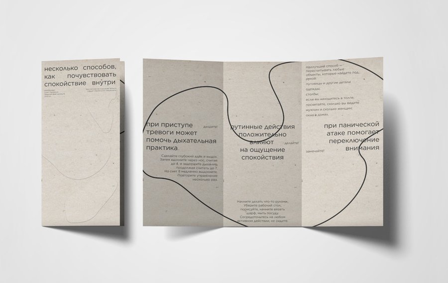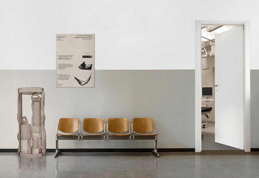 Advertising materials and POS-materials are located in places where people are most likely to experience stress: in the office, in the hospital waiting room. As a POS-material, a special packaging has been designed that contains all three products of the brand «vnutry».