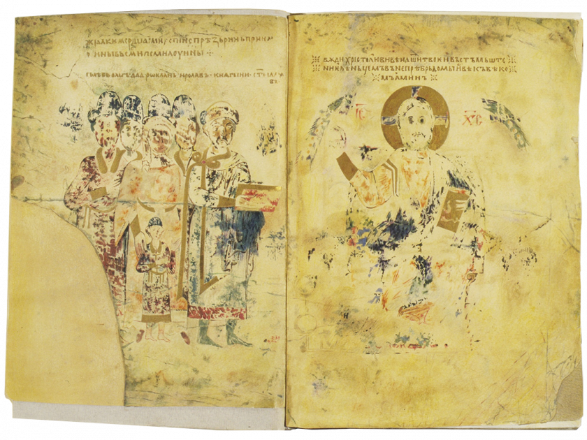 Первая миниатюра изборника изображает князя Святослава Ярославича с семьёй, предстоящих Христу на престоле.