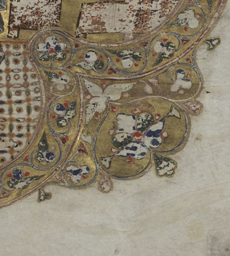 Это растительно-флоральный орнамент, расположен он строго в соответствии с симметрией в малые ячейки вокруг самой миниатюры, тем самым, напоминая нимб, обрамляет миниатюру, подчеркивая ее святость.
