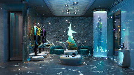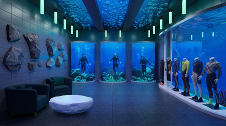 Промт: A realistic 3D interior design of an underwater sportswear store. The room is light has grey plaster walls with rockstone artwork in the center and lighted bubbles on the ceiling. The floor is covered with dark grey tiles. There are two dark blue, greenish armchairs and a white round table in front of the wall. On the right side, there is a narrow floor-to-ceiling cylindrical aquarium with wet costumes inside, and mannequins dressed in various diving suits. In the center, three large cylindrical tanks contain divers submerged underwater, with rocks and marine life visible. The room is illuminated by green and blue vertical lights hanging from the ceiling.