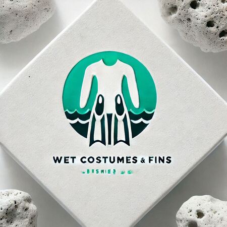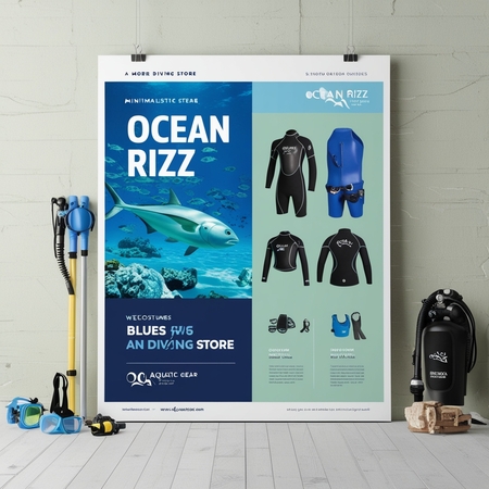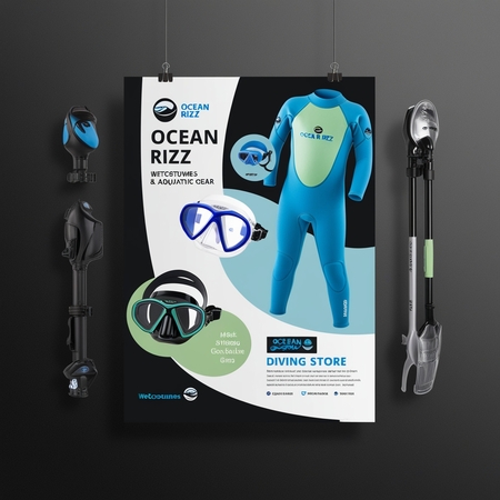Промт: Create a modern minimalistic poster for a diving store for «Ocean Rizz», a wetcostumes and aquatic gear company. blue and light green tones. The background is plaster wall. The design includes images of aqua gear items and fish. A strict and modern style with infographics and headlines. Photography is hyperrealism and high quality