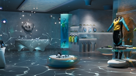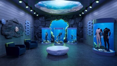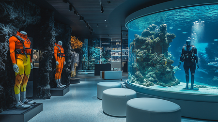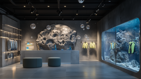 Промт: realistic 3D interior design of an underwater sportswear store, with grey walls featuring rockstone artwork in the center and lighted bubbles on the ceiling. grey floor is covered with dark grey tiles. On the left side are three manekens in wetcostumes in vibrant blue or green yellow and purple colors, displayed on the right from an installation made from aquarium. The background is light gray with subtle gradients, creating a sleek look that emphasizes their shapes. in the center there is bright aperture from the rock wall. In front of wall there are two dark blue greenish armchairs and white round table. On the right side is narrow floor-to-ceiling aquarium with wettcostume inside. This scene captures an atmosphere reminiscent of divers equipment show-like settings. The overall room has straight walls and slightly rounded corners, photo created through digital rendering and high-resolution photography. --s 250 --v 6.1 --ar 16:9