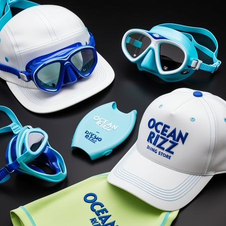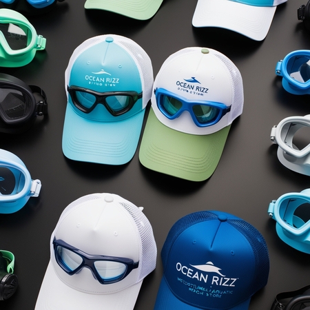 Промт: Caps as a merge for a diving store for «Ocean Rizz», a wetcostumes and aquatic gear company, Merch production is white, blue and light green tones on dark or black background. Masks on top of caps as a decor. The design includes images of aqua gear items and masks, with a digital, high-resolution. Photography is hyperrealism and high quality