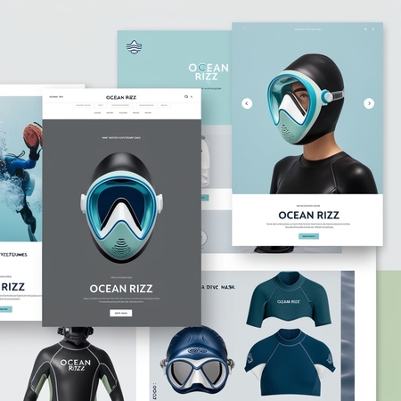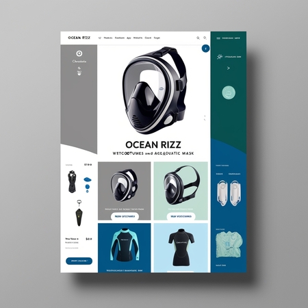Промт: Design of an e-commerce website UI for a company «Ocean Rizz», a wetcostumes and aquatic gear company, the poster features a new designed futuristic diving mask.You can use white, grey, blue and light green tones. The design includes images of wetcostumes and aqua gear items, with a digital, high-resolution, user-friendly interface in the style of Dribbble. The graphics are modern, flat, and highly detailed, with a touch of hyperrealism and high quality