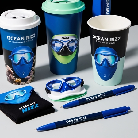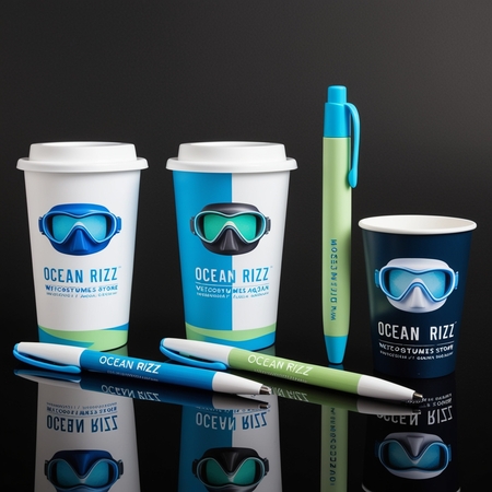 Промт: Cups and pens for a diving store for «Ocean Rizz», wetcostumes and aquatic gear company, Merch production is white, blue and light green tones on dark or black background. The design includes images of aqua gear items and masks, with a digital, high-resolution. Photography is hyperrealism and high quality