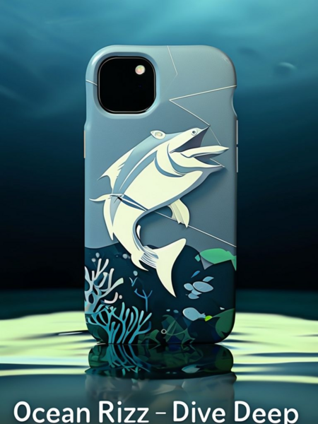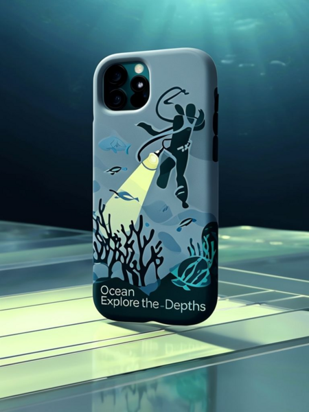Промт: Generate iphone case with «Ocean. Explore the Depths» featuring diver and underwater life. Use green, blue and dark blue tones.